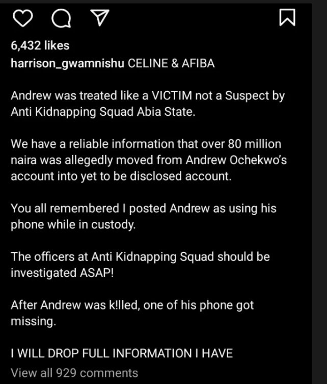 In a riveting post, he exposed a disturbing facet of the investigation, said despite being a prime suspect, Mr. Andrew was allegedly accorded undue empathy by the Anti-Kidnapping Squad in Abia State, casting doubt on the integrity of their handling of the case.