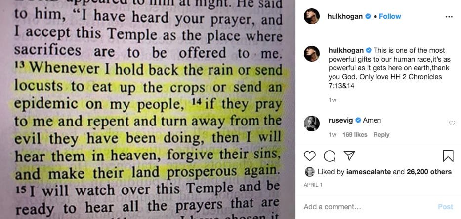 Hogan referenced 2 Chronicles 7:13-14, a scripture he had pointed to in an Instagram post earlier that week, to illustrate God’s promise of healing the land of those who repent and turn to him: