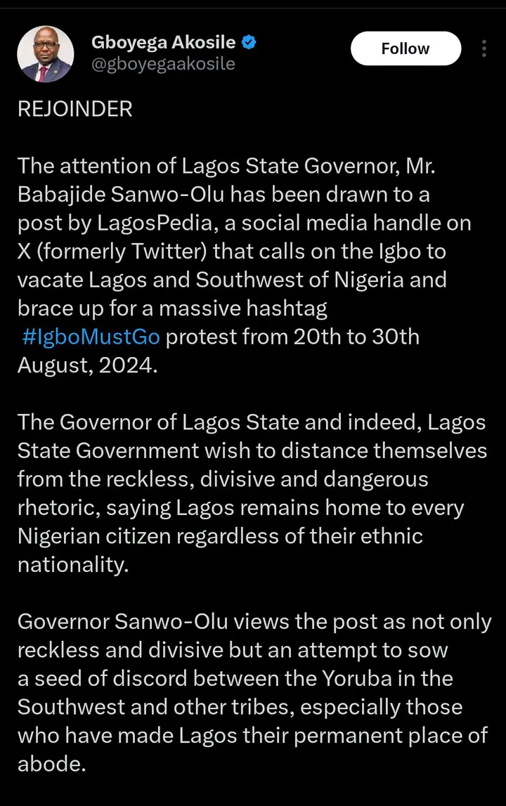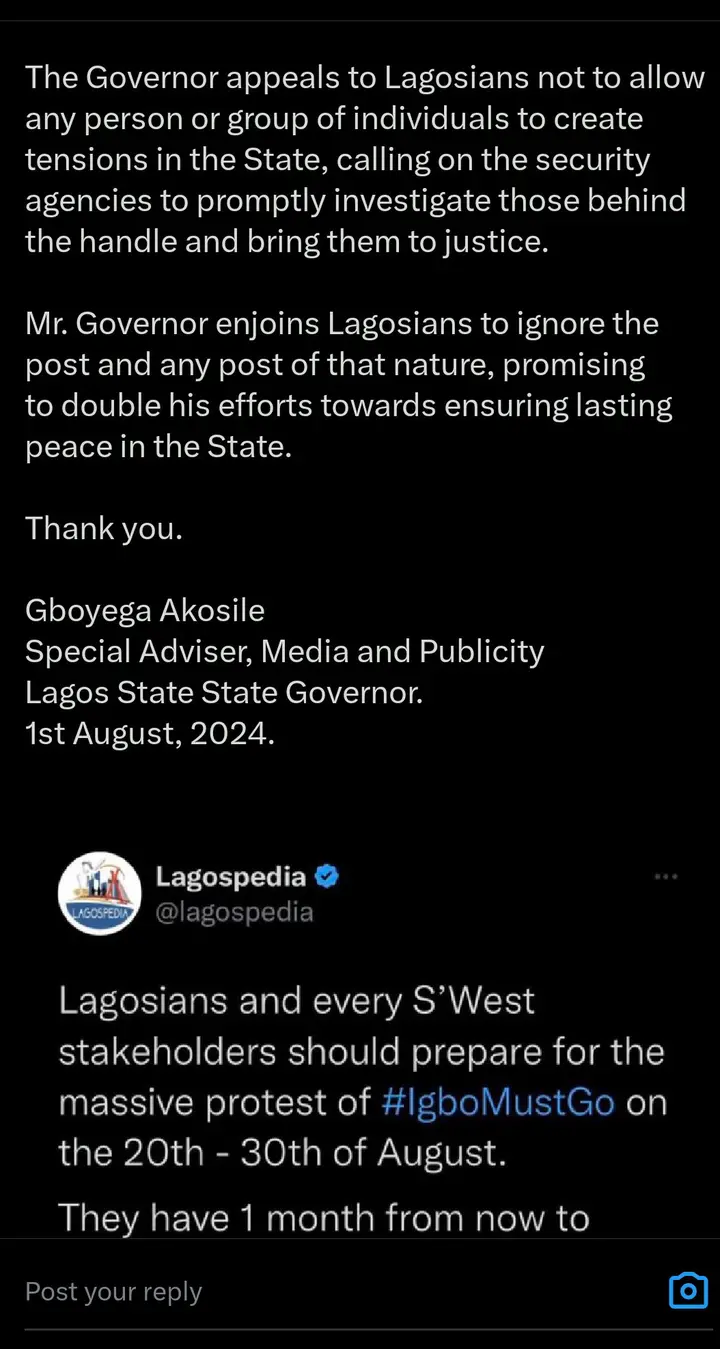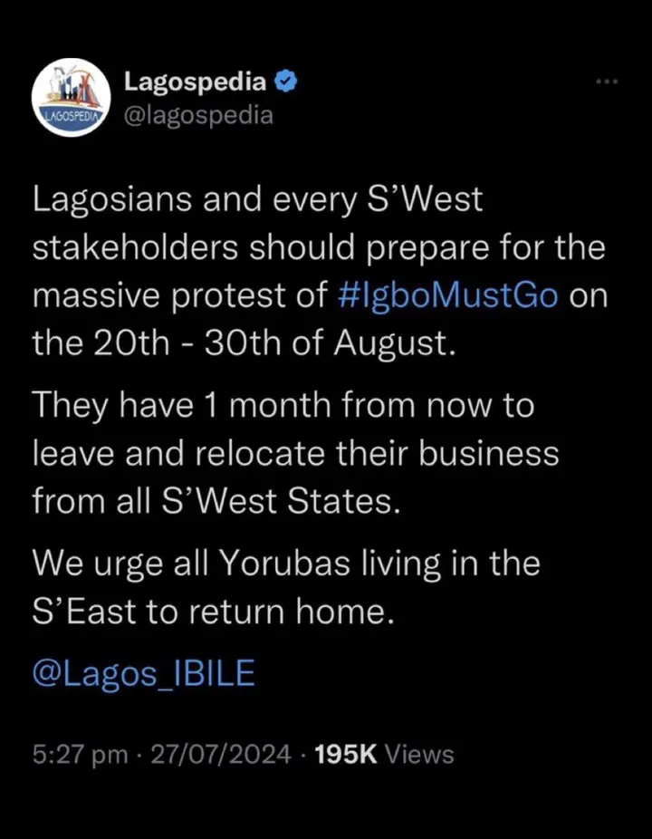 A recent social media post by the handle Lagospedia has sparked controversy and condemnation from the Lagos State Government. The post, made on X (formerly Twitter), called for a purported Igbo Must Go protest scheduled from August 20th to 30th, 2024, in Lagos and across Southwest Nigeria. It urged Igbo residents to vacate the region and suggested that Yorubas residing in the Southeast should return to their homeland, causing significant alarm and backlash.