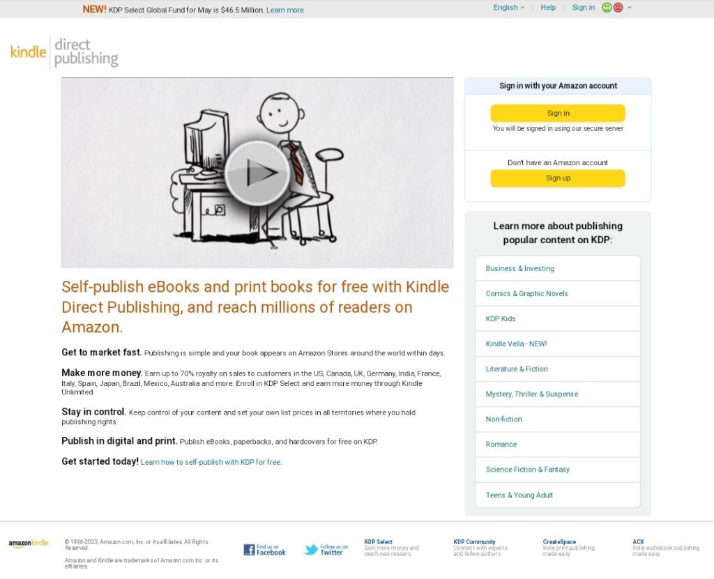 Visit kdp.amazon.com and choose “Sign in” or “Sign up.”