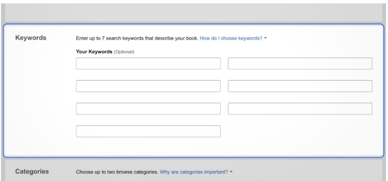 Choose your keywords carefully. When you fill in these boxes, what you’re really saying is: when people enter these words in an Amazon search, I want my book to come up. They should relate directly to the reader’s pain that your book can solve.
