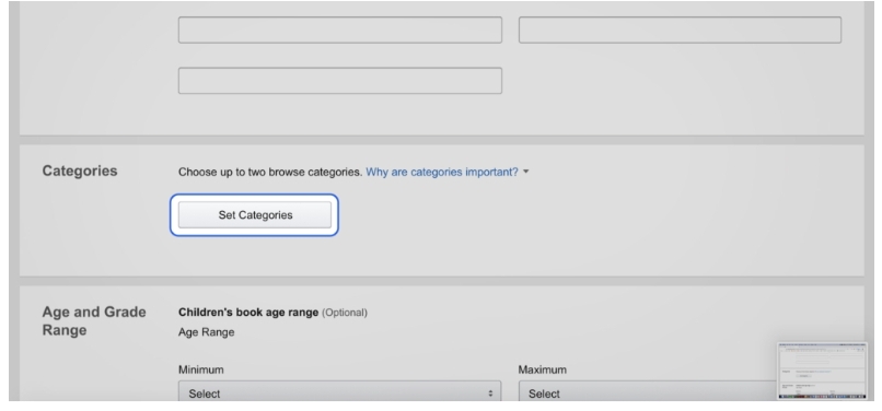 Use the Categories popup box to choose two categories for your book. Use the “+” buttons to drill down as far as you can. This is a crucial marketing decision that will determine the visibility of your book, the competition it faces, and the likelihood of achieving bestseller status.