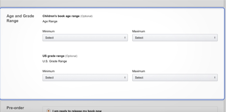If your book is for teens or younger readers, select the appropriate minimum and maximum age range for the target audience. Otherwise, leave this box blank.