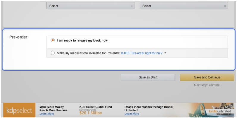 KDP Select enrolls your book in Kindle Unlimited and provides additional marketing options, such as Kindle countdown deals. However, the digital version of your book has to be exclusive to Amazon. You can always add your book to KDP Select after it’s published, but once it’s in the program, you have to leave it there for at least three months. Make this decision as part of your overall book marketing plan.