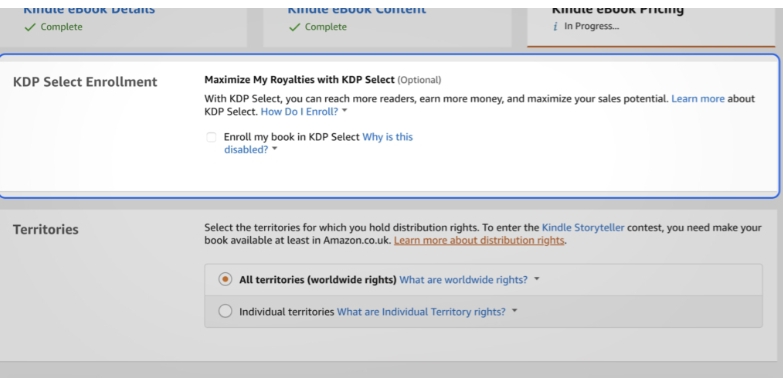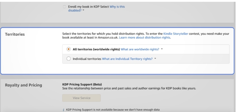 Choose “All territories (worldwide rights)” unless you have a good reason not to. This step will make your book available in all of Amazon’s global territories once you’re ready to publish it.