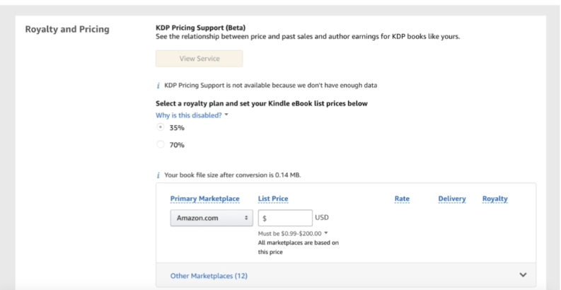 Choose between 35% and 70% for your royalty. For most authors, the 70% royalty will pay more. However, it does add some pricing limitations as well as a slightly different royalty calculation. Choose Amazon.com as your primary marketplace, then set the list price. The price in other marketplaces will be set according to exchange rates, but you can set each one manually if you want to.