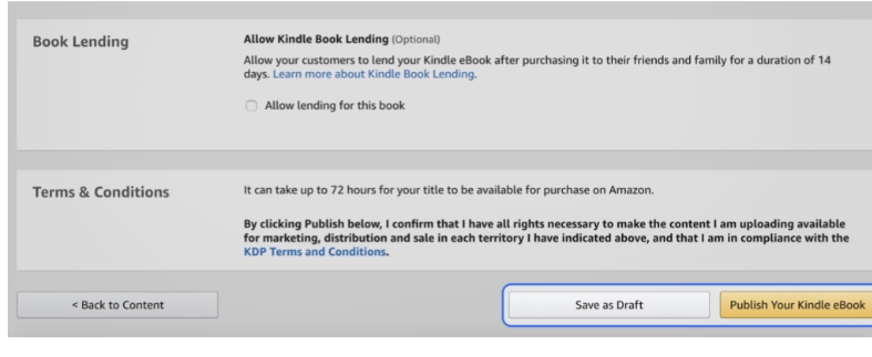Choose “Save as Draft” until you’re ready to choose a publishing date and launch your book. It is essential to think through every aspect of your book’s marketing before you publish. This includes your book’s cover, layout, pricing, marketing plan, and author branding. Set up your Amazon Author page with your author photo and bio, and add any blurbs to your book’s detail page.