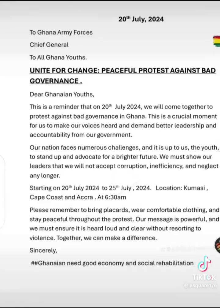 A notice is circulating on social media platforms of Ghanian youths informing the Chief General of the upcoming protests against bad governance.