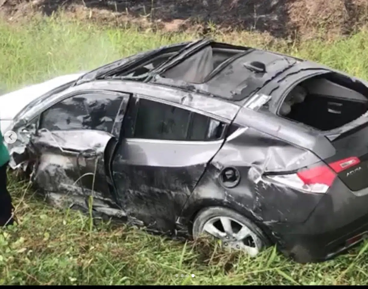 “This is my vehicle that somersaulted over 8times into the bush from the road . May the souls of the departed Rest in peace. That had a head on coalition with us 🙏🔥