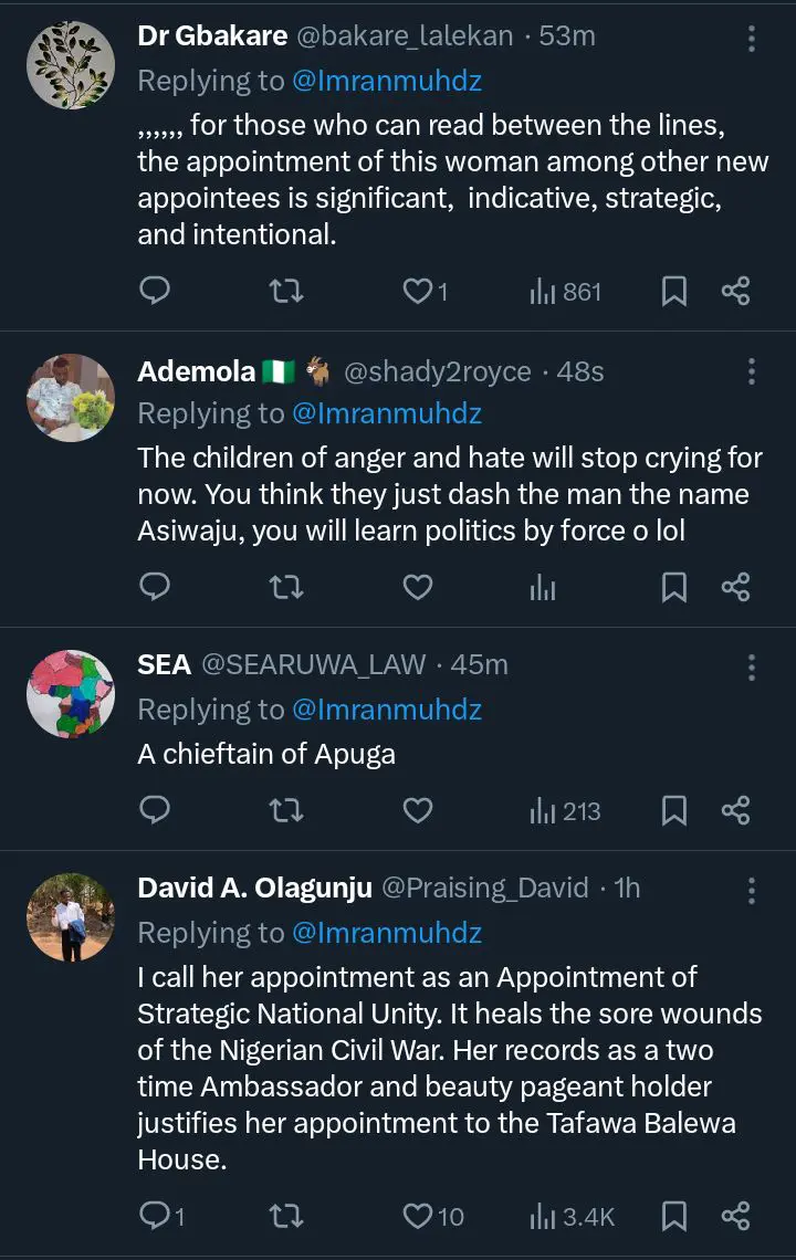 Another supporter described the decision as an “Appointment of Strategic National Unity.” According to this viewpoint, Ojukwu’s appointment symbolizes healing the deep wounds of the Nigerian Civil War, given her marriage to the late Biafran leader. “Her records as a two-time ambassador and beauty pageant holder justify her appointment to the Tafawa Balewa House,” the supporter added.