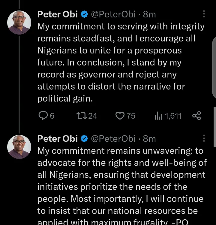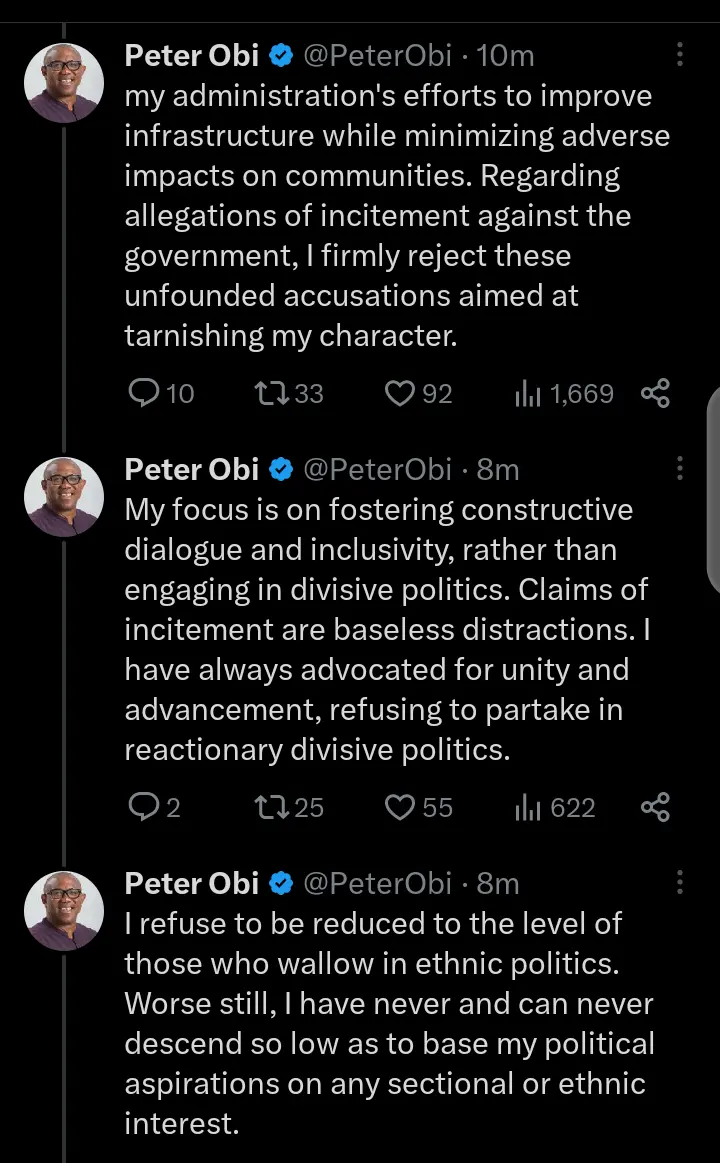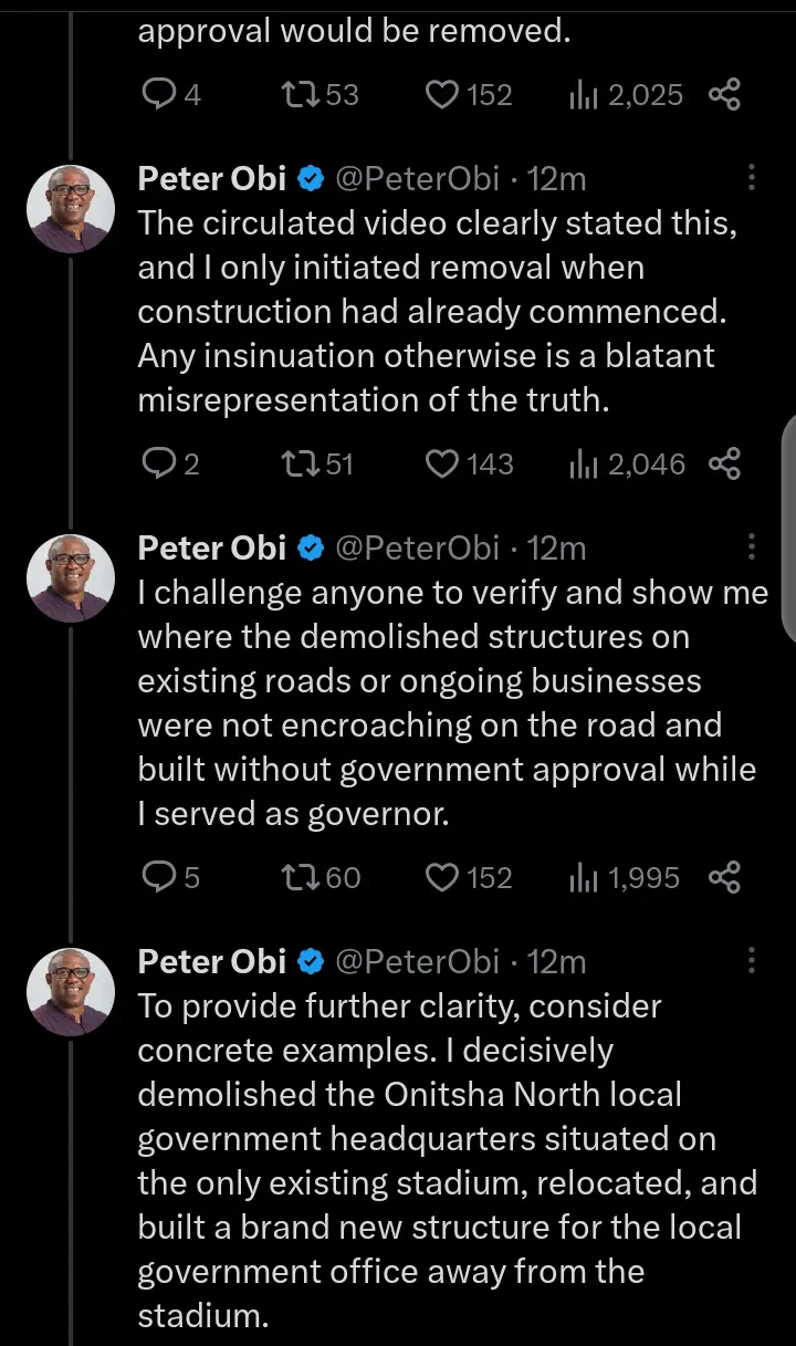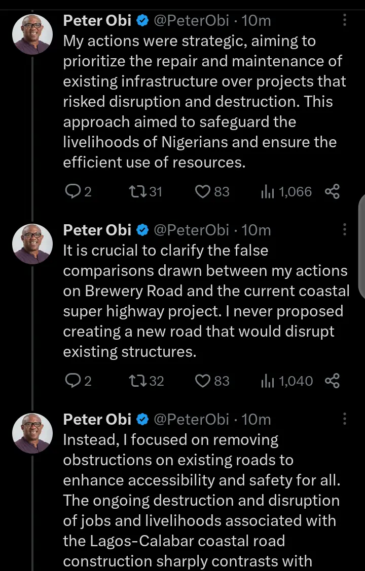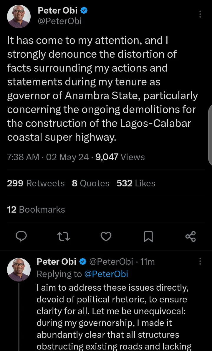And so Peter Obi in response to such accusation, took to his official X account to state that he strongly denounce the distortion of facts surrounding his actions and statements during his tenure as governor of Anambra State, particularly concerning the ongoing demolitions for the construction of the Lagos-Calabar Coastal highway.