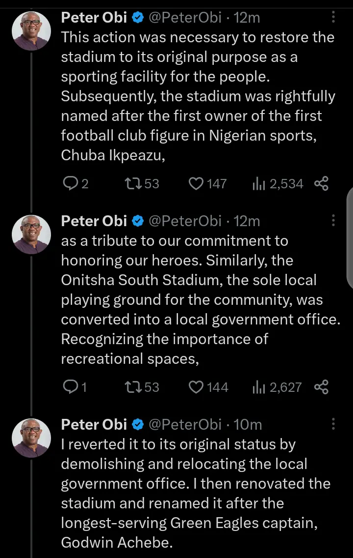 The businessman then disclosed that he built a new Onitsha North local government office and converted the Onitsha South stadium into a local government office, adding that his action was necessary to restore the stadium in his state to its original purpose.