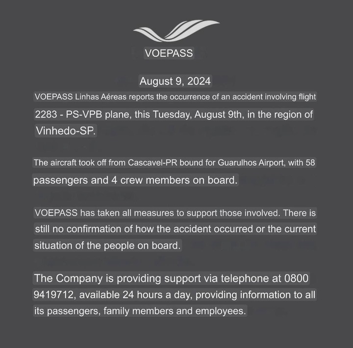 The company, Voepass in a statement acknowledged the crash but said an immediate update cannot be given on the status of the 58 passengers and 4 crew members on board.