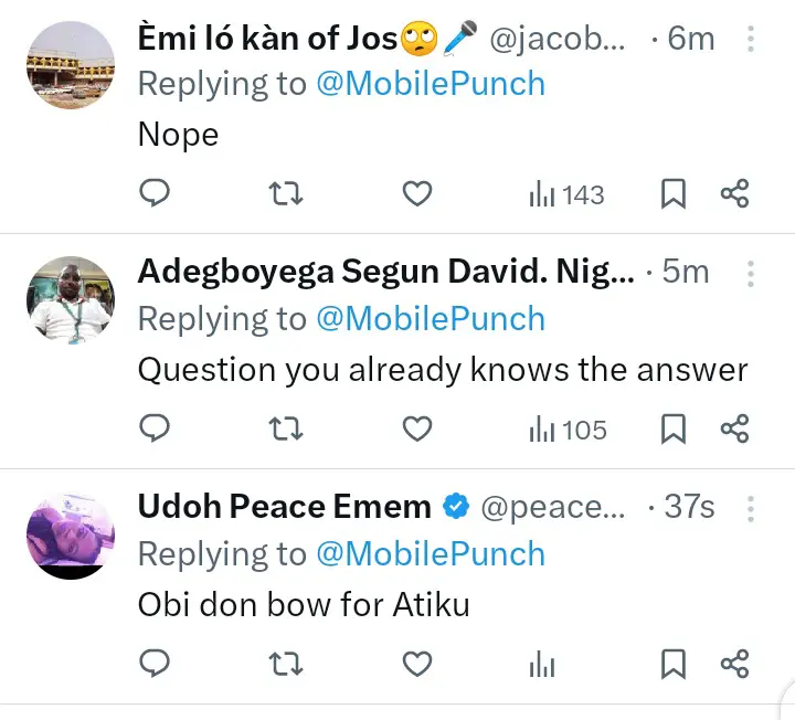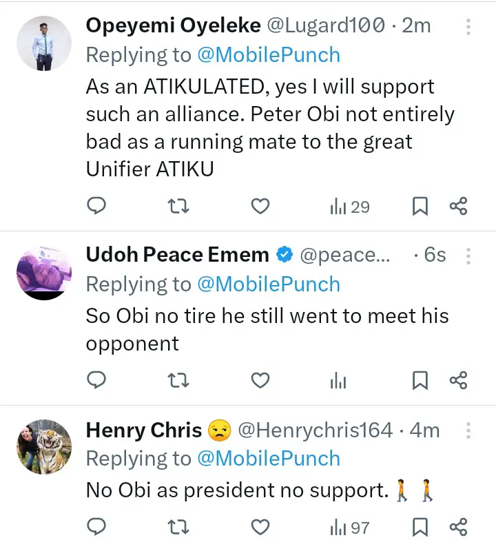 PUNCH’s tweet read: “Atikulates and Obidients, this poll is for you. In light of the unexpected meeting between Peter Obi and Atiku, would you support a combined Peoples Democratic Party-Labour Party ticket with Atiku as the presidential candidate and Peter Obi as the vice presidential candidate?”