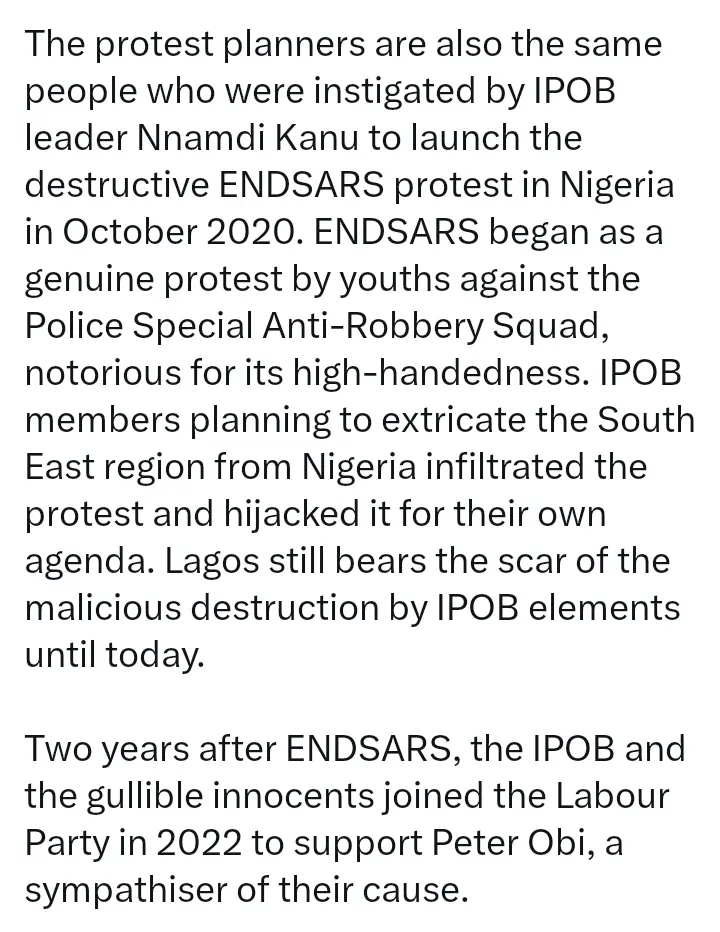“Don’t be fooled: the malcontents planning to stage nationwide protests are supporters of Peter Obi, the failed presidential candidate of the Labour Party. And he should be held responsible for whatever crisis emanates from the action. The protest planners are also the same people who were instigated by IPOB leader, Nnamdi Kanu to launch the destructive #EndSars protest in Nigeria in October 2020. #EndSars began as a genuine protest by youths against the Police Special Anti-Robbery Squad, notorious for its high-handedness. IPOB members planning to extricate the South East region from Nigeria infiltrated the protest and hijacked it for their own agenda. Lagos still bears the scar of the malicious destruction by IPOB elements until today”.
