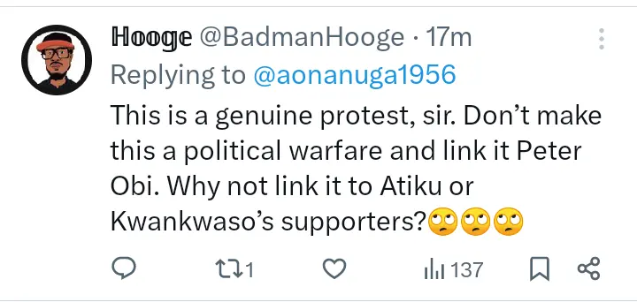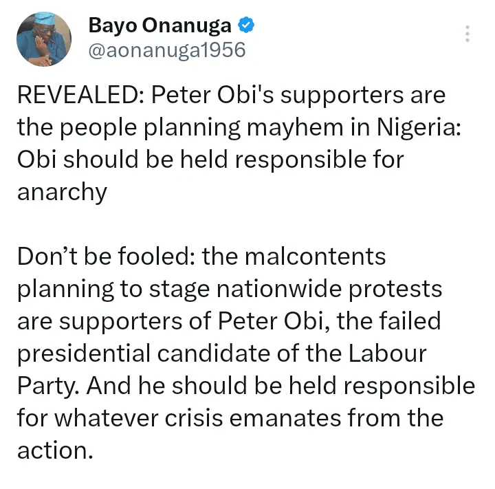 There have been several reactions from social media users after Bayo Onanuga, the Special Adviser to President Bola Tinubu on Information and Strategy, stated that the former governor of Anambra state, Peter Obi should be arrested for anarchy because his supporters are the ones behind nationwide protest.