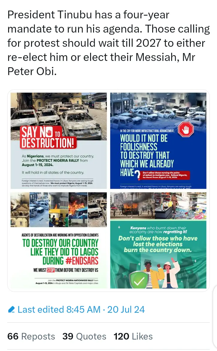 He made the statement on his official X handle on Saturday. In the post that he shared on his official page, he said those planning the nationwide protest are supporters of the former governor of Anambra state and he should be held responsible for whatever crisis that emanates from the action. Bayo Onanuga also stated that the protest planners are the same people who were instigated by Nnamdi Kanu to launch the #EndSars protest in 2020.