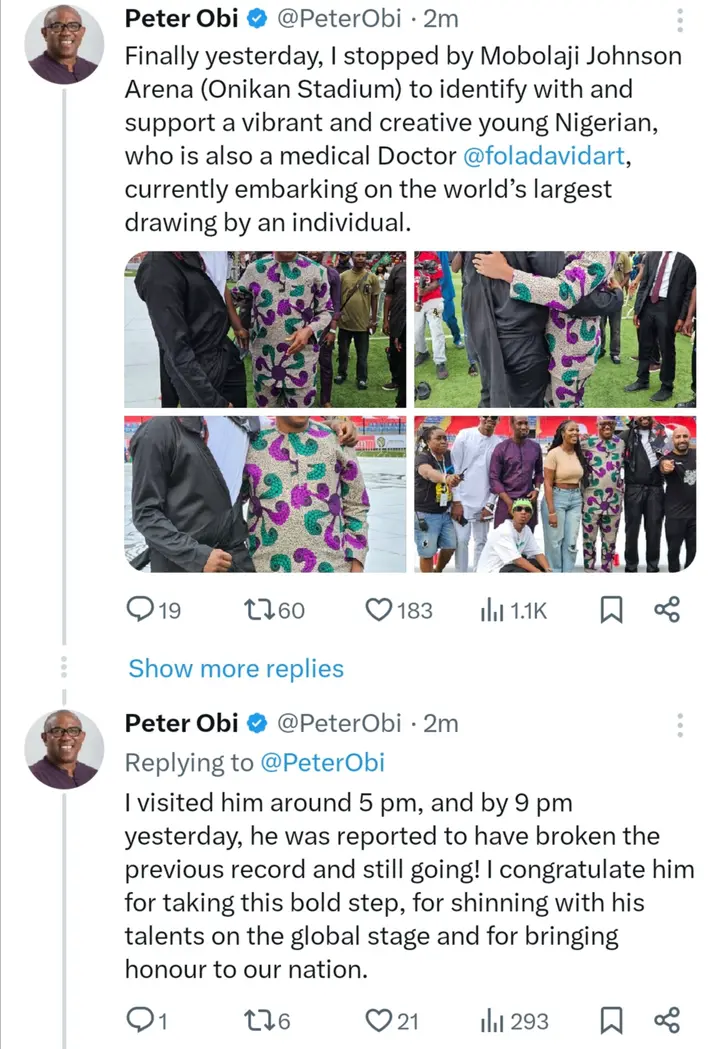 Peter Obi had visited Mobolaji Johnson Arena (Onikan Stadium) to support a young Nigerian medical doctor, who had already broken the previous record for the world’s largest drawing.