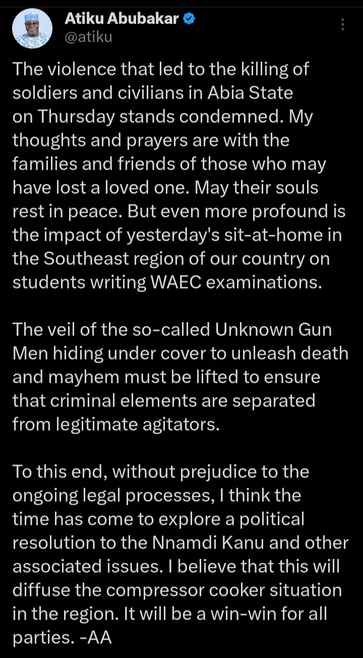 Former Vice President, Atiku Abubakar has condemned the violence in Abia State that resulted in the killing of 5 soldiers in Abia state.