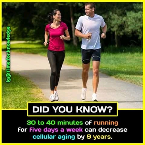 30 to 40 minutes of running for five days in a week can decrease cellular aging by nine years
