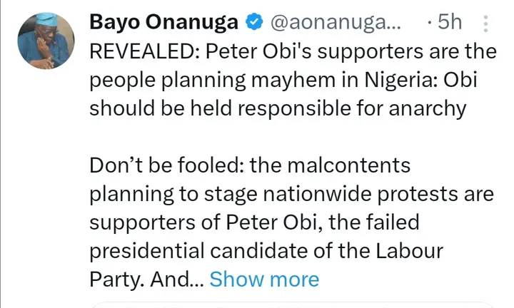 In a statement he shared on X, formerly known as Twitter, on Saturday, Bayo Onanuga said that he has found out that Obi’s supporters are the people behind the planned protests. He added that Peter Obi should be held responsible for whatever becomes of the protests.