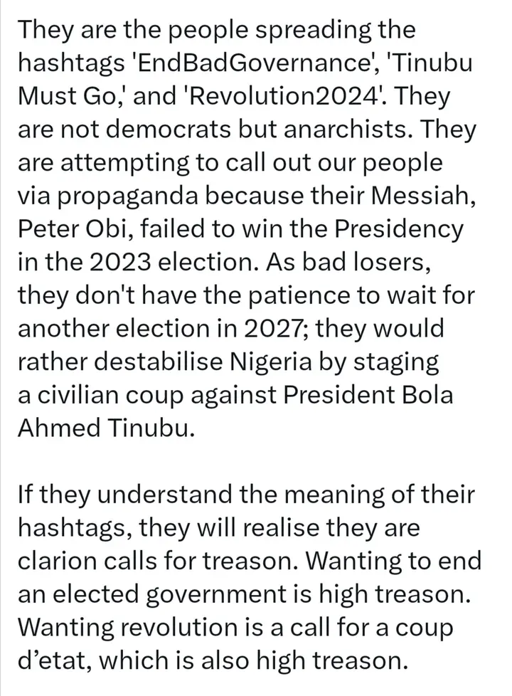 “Don’t be fooled: the malcontents planning to stage nationwide protests are supporters of Peter Obi, the failed presidential candidate of the Labour Party. And he should be held responsible for whatever crisis emanates from the action.”