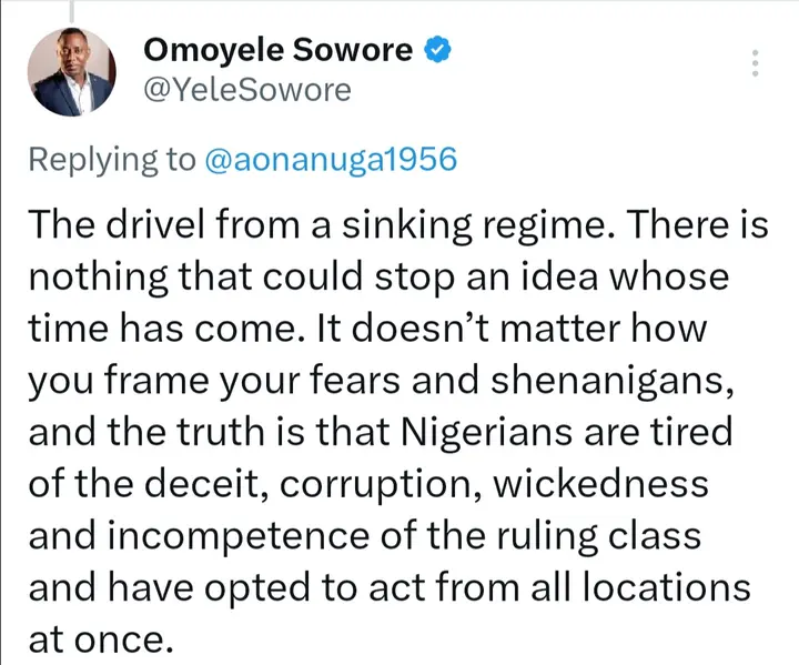 He said, “The drivel from a sinking regime. There is nothing that could stop an idea whose time has come. It doesn’t matter how you frame your fears and shenanigans, and the truth is that Nigerians are tired of the deceit, corruption, wickedness and incompetence of the ruling class and have opted to act from all locations at once.”
