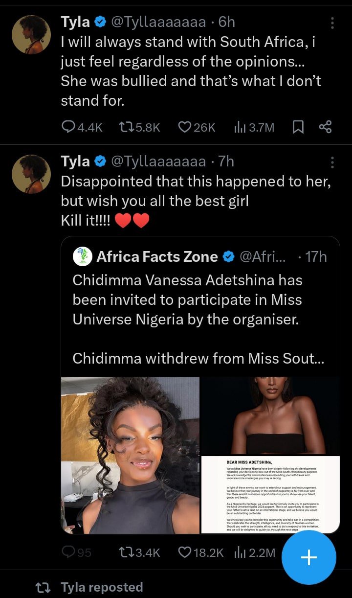- South Africans drags Tyla over her support for Nigerian beauty Queen, Adetshina