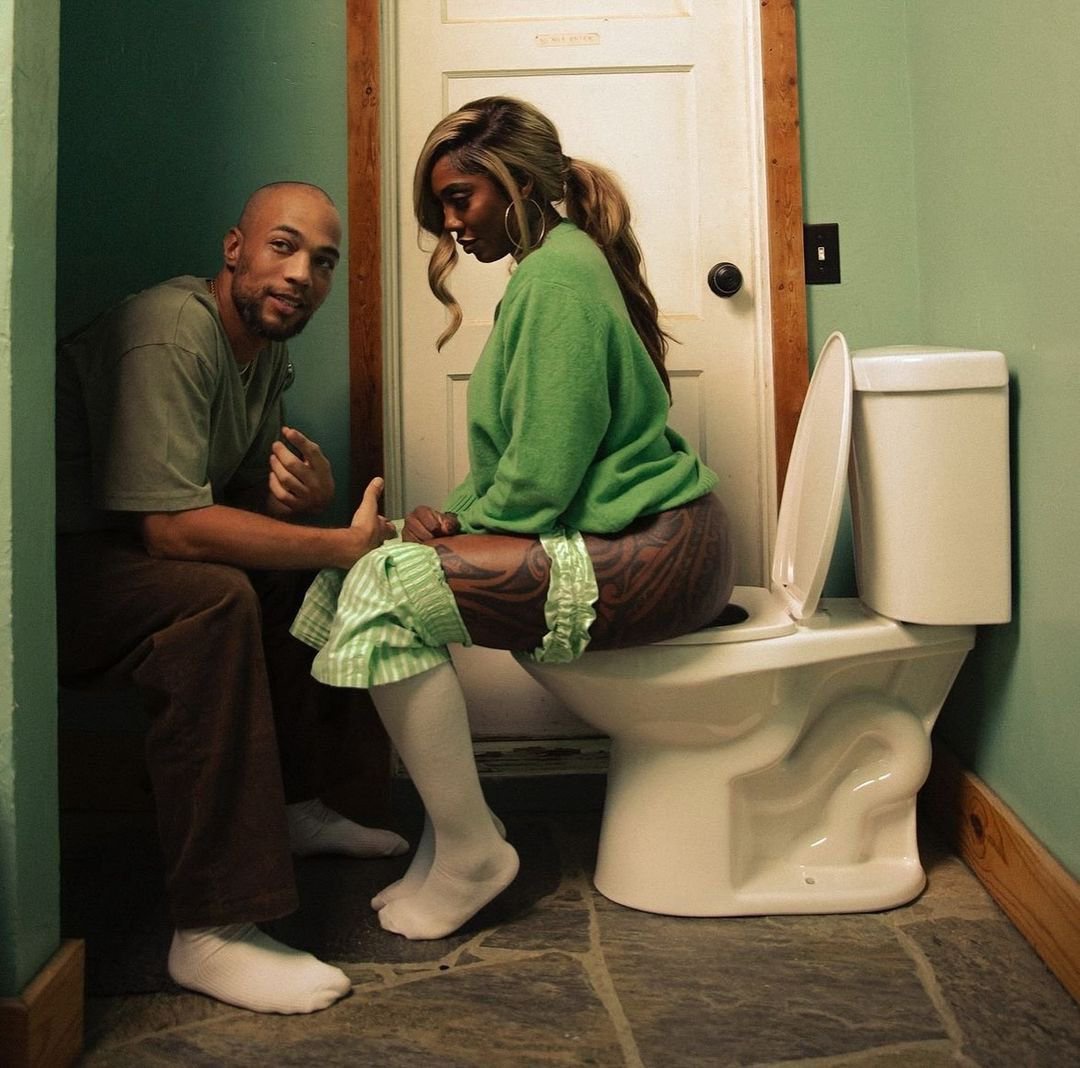 - In the snapshot, Tiwa Savage is seen sitting on the toilet sink visibly stripped off her underpants while a man sat directly opposite.