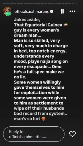 Controversial actress, Sarah Martins shares why she feels that the viral Equatorial Guinea guy is every woman’s dream, despite the scandals trailing him.